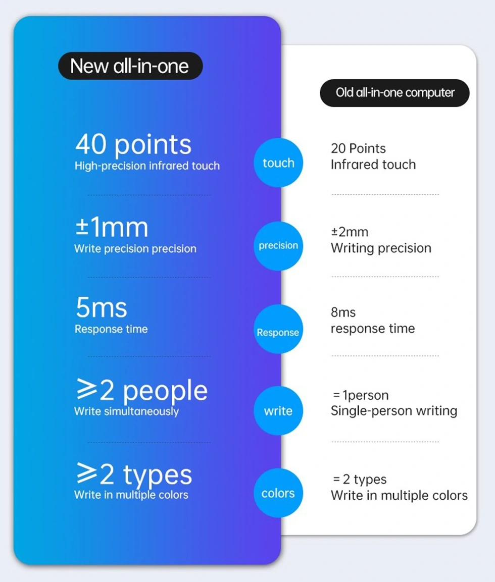 Kehittynyt infrapunakosketustekniikka edistää saumatonta yhteistyötä erittäin herkästi reagoivalla ja tarkalla kosketusvuorovaikutuksella. Se tukee monen käyttäjän yhteistyötä 40 kosketuspisteellä ja intuitiivisilla eleohjauksilla zoomausta ja navigointia varten. Tekniikka tarjoaa myös mukautettavat kynäasetukset ja laajennettavan työtilan, joka mukautuu erilaisiin ammatillisiin tarpeisiin.